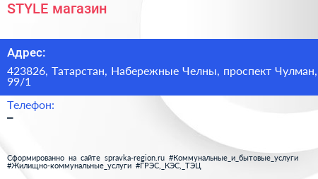 STYLE, магазин по адресу 423826, Татарстан, Набережные Челны, проспект Чулман, 99/1 в дальнейшем Организация, размещена в следующих категориях: