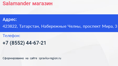 Salamander, магазин по адресу 423822, Татарстан, Набережные Челны, проспект Мира, 3 в дальнейшем Организация, размещена в следующих категориях: