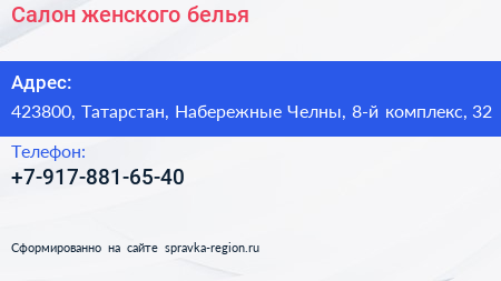 Салон женского белья по адресу 423800, Татарстан, Набережные Челны, 8-й комплекс, 32 в дальнейшем Организация, размещена в следующих категориях: