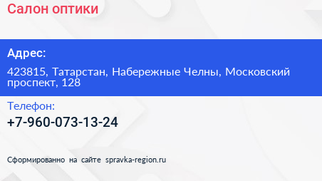 Салон оптики по адресу 423815, Татарстан, Набережные Челны, Московский проспект, 128 в дальнейшем Организация, размещена в следующих категориях: