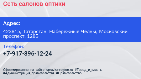 Сеть салонов оптики по адресу 423815, Татарстан, Набережные Челны, Московский проспект, 128Б в дальнейшем Организация, размещена в следующих категориях: