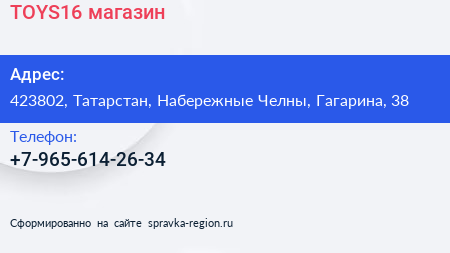 TOYS16, магазин по адресу 423802, Татарстан, Набережные Челны, Гагарина, 38 в дальнейшем Организация, размещена в следующих категориях: