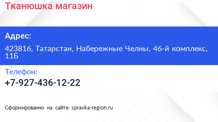 Тканюшка, магазин по адресу 423816, Татарстан, Набережные Челны, 46-й комплекс, 11Б в дальнейшем Организация, размещена в следующих категориях: