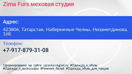 Zima Furs, меховая студия по адресу 423806, Татарстан, Набережные Челны, Низаметдинова, 16Б в дальнейшем Организация, размещена в следующих категориях: