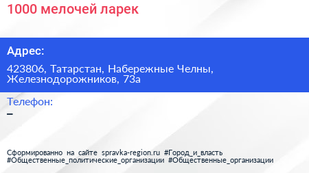 1000 мелочей, ларек по адресу 423806, Татарстан, Набережные Челны, Железнодорожников, 73а в дальнейшем Организация, размещена в следующих категориях: