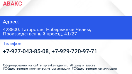 АВАКС по адресу 423800, Татарстан, Набережные Челны, Производственный проезд, 41/27 в дальнейшем Организация, размещена в следующих категориях: