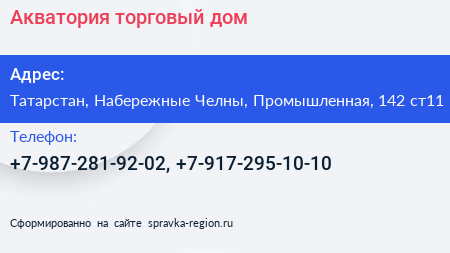 Акватория, торговый дом по адресу Татарстан, Набережные Челны, Промышленная, 142 ст11 в дальнейшем Организация, размещена в следующих категориях: