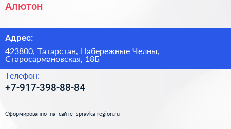 Алютон по адресу 423800, Татарстан, Набережные Челны, Старосармановская, 18Б в дальнейшем Организация, размещена в следующих категориях: