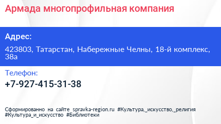 Армада, многопрофильная компания по адресу 423803, Татарстан, Набережные Челны, 18-й комплекс, 38а в дальнейшем Организация, размещена в следующих категориях: