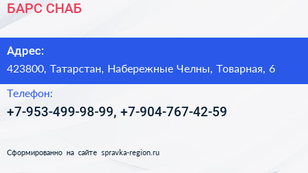 БАРС СНАБ по адресу 423800, Татарстан, Набережные Челны, Товарная, 6 в дальнейшем Организация, размещена в следующих категориях: