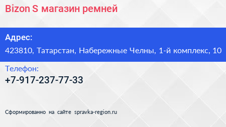 Bizon-S, магазин ремней по адресу 423810, Татарстан, Набережные Челны, 1-й комплекс, 10 в дальнейшем Организация, размещена в следующих категориях: