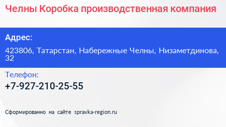 Челны-Коробка, производственная компания по адресу 423806, Татарстан, Набережные Челны, Низаметдинова, 32 в дальнейшем Организация, размещена в следующих категориях: