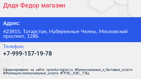 Дядя Федор, магазин по адресу 423815, Татарстан, Набережные Челны, Московский проспект, 128Б в дальнейшем Организация, размещена в следующих категориях: