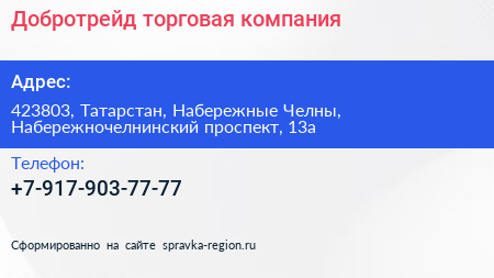 Добротрейд, торговая компания по адресу 423803, Татарстан, Набережные Челны, Набережночелнинский проспект, 13а в дальнейшем Организация, размещена в следующих категориях: