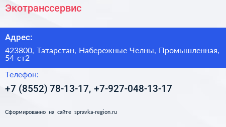 Экотранссервис по адресу 423800, Татарстан, Набережные Челны, Промышленная, 54 ст2 в дальнейшем Организация, размещена в следующих категориях: