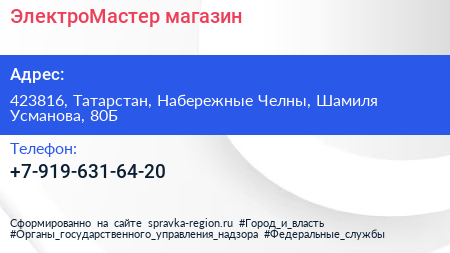 ЭлектроМастер, магазин по адресу 423816, Татарстан, Набережные Челны, Шамиля Усманова, 80Б в дальнейшем Организация, размещена в следующих категориях: