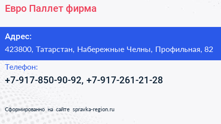 Евро-Паллет, фирма по адресу 423800, Татарстан, Набережные Челны, Профильная, 82 в дальнейшем Организация, размещена в следующих категориях: