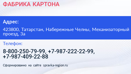 ФАБРИКА КАРТОНА по адресу 423800, Татарстан, Набережные Челны, Механизаторный проезд, 3а в дальнейшем Организация, размещена в следующих категориях: