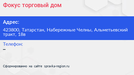 Фокус, торговый дом по адресу 423800, Татарстан, Набережные Челны, Альметьевский тракт, 18в в дальнейшем Организация, размещена в следующих категориях:
