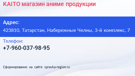 KAITO, магазин аниме-продукции по адресу 423810, Татарстан, Набережные Челны, 3-й комплекс, 7 в дальнейшем Организация, размещена в следующих категориях: