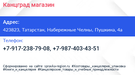 Канцград, магазин по адресу 423823, Татарстан, Набережные Челны, Пушкина, 4а в дальнейшем Организация, размещена в следующих категориях: