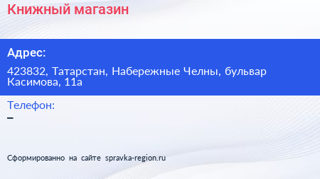 Книжный магазин по адресу 423832, Татарстан, Набережные Челны, бульвар Касимова, 11а в дальнейшем Организация, размещена в следующих категориях: