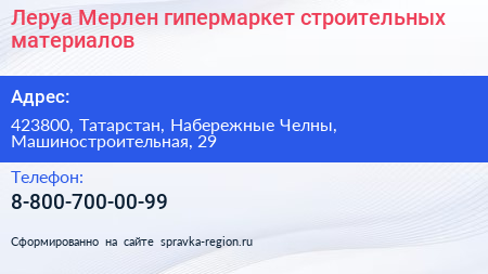 Леруа Мерлен, гипермаркет строительных материалов по адресу 423800, Татарстан, Набережные Челны, Машиностроительная, 29 в дальнейшем Организация, размещена в следующих категориях: