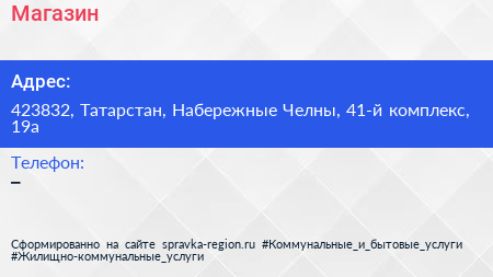 Магазин по адресу 423832, Татарстан, Набережные Челны, 41-й комплекс, 19а в дальнейшем Организация, размещена в следующих категориях: