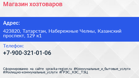 Магазин хозтоваров по адресу 423820, Татарстан, Набережные Челны, Казанский проспект, 129 к1 в дальнейшем Организация, размещена в следующих категориях: