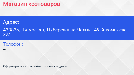 Магазин хозтоваров по адресу 423826, Татарстан, Набережные Челны, 49-й комплекс, 22а в дальнейшем Организация, размещена в следующих категориях: