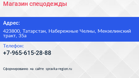 Магазин спецодежды по адресу 423800, Татарстан, Набережные Челны, Мензелинский тракт, 35а в дальнейшем Организация, размещена в следующих категориях: