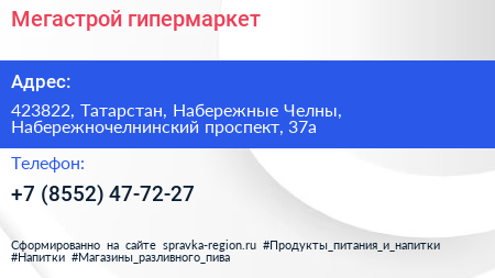Мегастрой, гипермаркет по адресу 423822, Татарстан, Набережные Челны, Набережночелнинский проспект, 37а в дальнейшем Организация, размещена в следующих категориях: