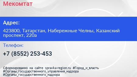 Мекомтат по адресу 423800, Татарстан, Набережные Челны, Казанский проспект, 220а в дальнейшем Организация, размещена в следующих категориях: