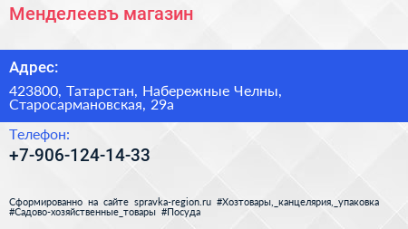 Менделеевъ, магазин по адресу 423800, Татарстан, Набережные Челны, Старосармановская, 29а в дальнейшем Организация, размещена в следующих категориях: