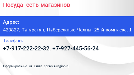 Посуда+, сеть магазинов по адресу 423827, Татарстан, Набережные Челны, 25-й комплекс, 1 в дальнейшем Организация, размещена в следующих категориях: