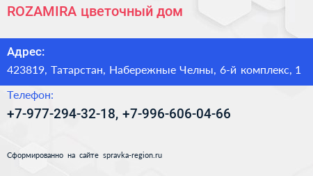 ROZAMIRA, цветочный дом по адресу 423819, Татарстан, Набережные Челны, 6-й комплекс, 1 в дальнейшем Организация, размещена в следующих категориях: