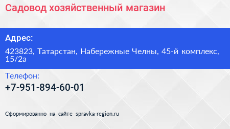 Садовод, хозяйственный магазин по адресу 423823, Татарстан, Набережные Челны, 45-й комплекс, 15/2а в дальнейшем Организация, размещена в следующих категориях: