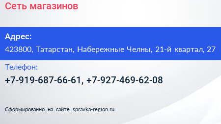 Сеть магазинов по адресу 423800, Татарстан, Набережные Челны, 21-й квартал, 27 в дальнейшем Организация, размещена в следующих категориях: