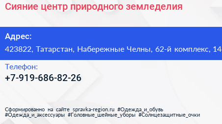 Сияние, центр природного земледелия по адресу 423822, Татарстан, Набережные Челны, 62-й комплекс, 14 в дальнейшем Организация, размещена в следующих категориях: