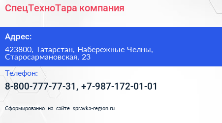 СпецТехноТара, компания по адресу 423800, Татарстан, Набережные Челны, Старосармановская, 23 в дальнейшем Организация, размещена в следующих категориях: