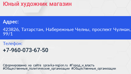 Юный художник, магазин по адресу 423826, Татарстан, Набережные Челны, проспект Чулман, 99/1 в дальнейшем Организация, размещена в следующих категориях: