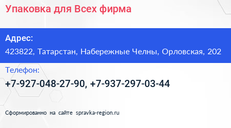 Упаковка для Всех, фирма по адресу 423822, Татарстан, Набережные Челны, Орловская, 202 в дальнейшем Организация, размещена в следующих категориях: