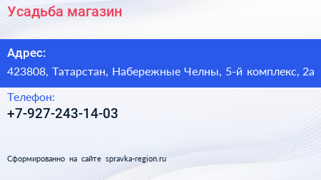Усадьба, магазин по адресу 423808, Татарстан, Набережные Челны, 5-й комплекс, 2а в дальнейшем Организация, размещена в следующих категориях: