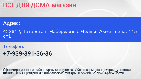 ВСЁ ДЛЯ ДОМА, магазин по адресу 423812, Татарстан, Набережные Челны, Ахметшина, 115 ст1 в дальнейшем Организация, размещена в следующих категориях: