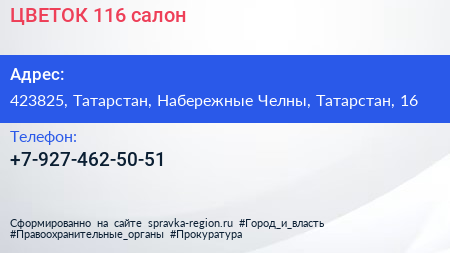 ЦВЕТОК 116, салон по адресу 423825, Татарстан, Набережные Челны, Татарстан, 16 в дальнейшем Организация, размещена в следующих категориях: