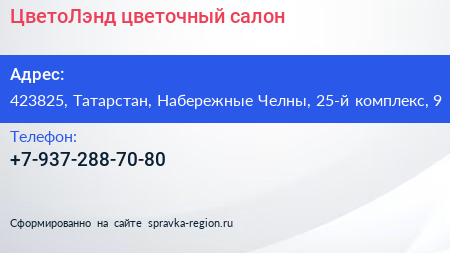 ЦветоЛэнд, цветочный салон по адресу 423825, Татарстан, Набережные Челны, 25-й комплекс, 9 в дальнейшем Организация, размещена в следующих категориях:
