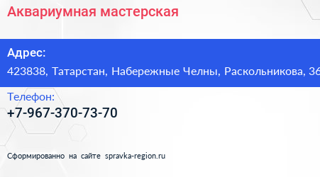 Аквариумная мастерская по адресу 423838, Татарстан, Набережные Челны, Раскольникова, 36 в дальнейшем Организация, размещена в следующих категориях: