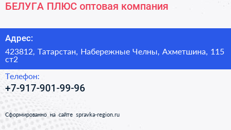 БЕЛУГА ПЛЮС, оптовая компания по адресу 423812, Татарстан, Набережные Челны, Ахметшина, 115 ст2 в дальнейшем Организация, размещена в следующих категориях: