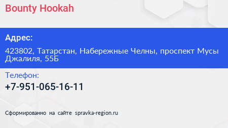 Bounty Hookah по адресу 423802, Татарстан, Набережные Челны, проспект Мусы Джалиля, 55Б в дальнейшем Организация, размещена в следующих категориях:
