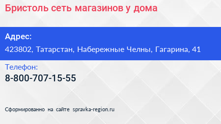 Бристоль, сеть магазинов у дома по адресу 423802, Татарстан, Набережные Челны, Гагарина, 41 в дальнейшем Организация, размещена в следующих категориях: